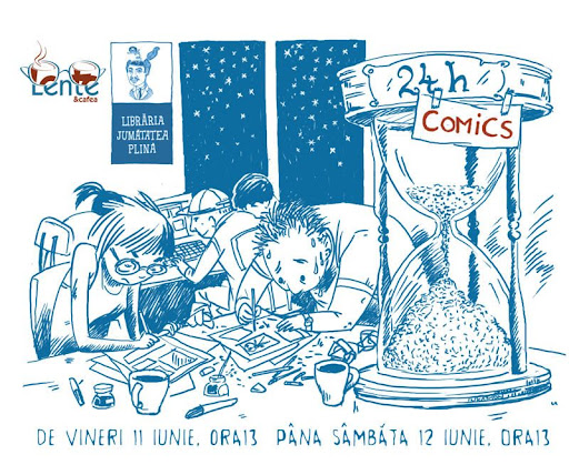 ParticipantIn urma cu ceva vreme am initiat un sondaj sa vedem daca ar fi lume interesata de organizarea in Romania a „24h comics”. Au raspuns 24 de oameni din care 22 cu „da, absolut”. Asa ca Veronica Solomon s-a decis sa organizeze acest interesant eveniment. Organizat impreuna cu Libraria Jumatatea Plina , sesiunea de desen va avea loc in cadrul Noptii Albe a Galeriilor la Cafe Lente, incepand de vineri 11 iunie, ora13, pana sambata 12 iunie ora 13.